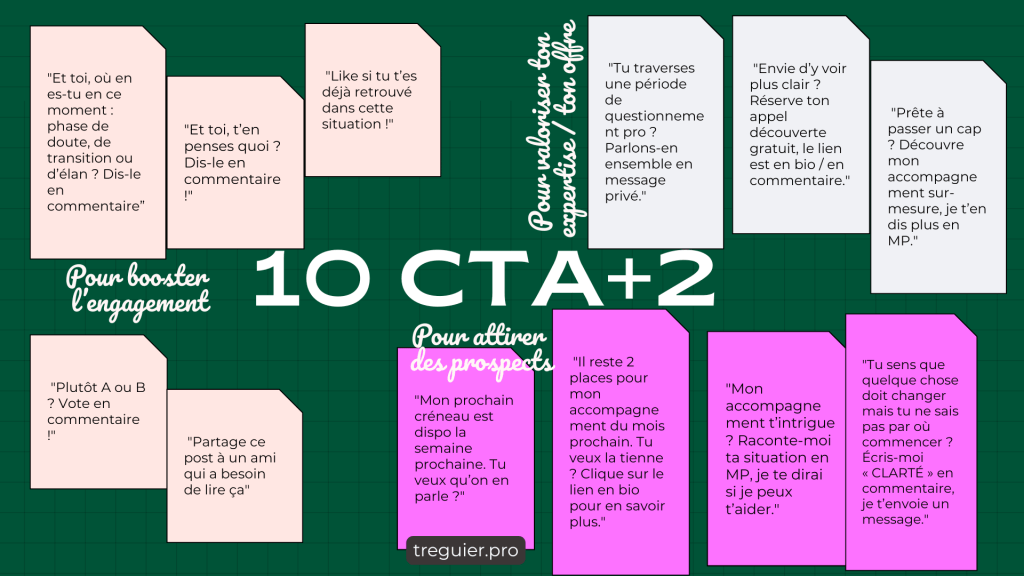J’ai rassemblé dans ce visuel 12 CTA testés et pensés pour les coachs, freelances, et pros du service :